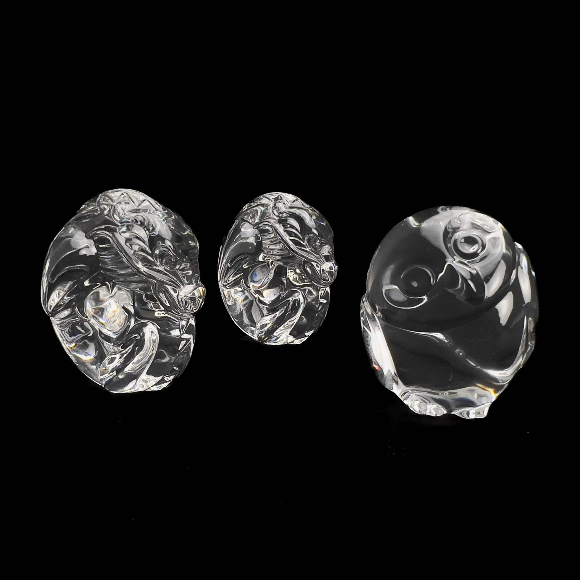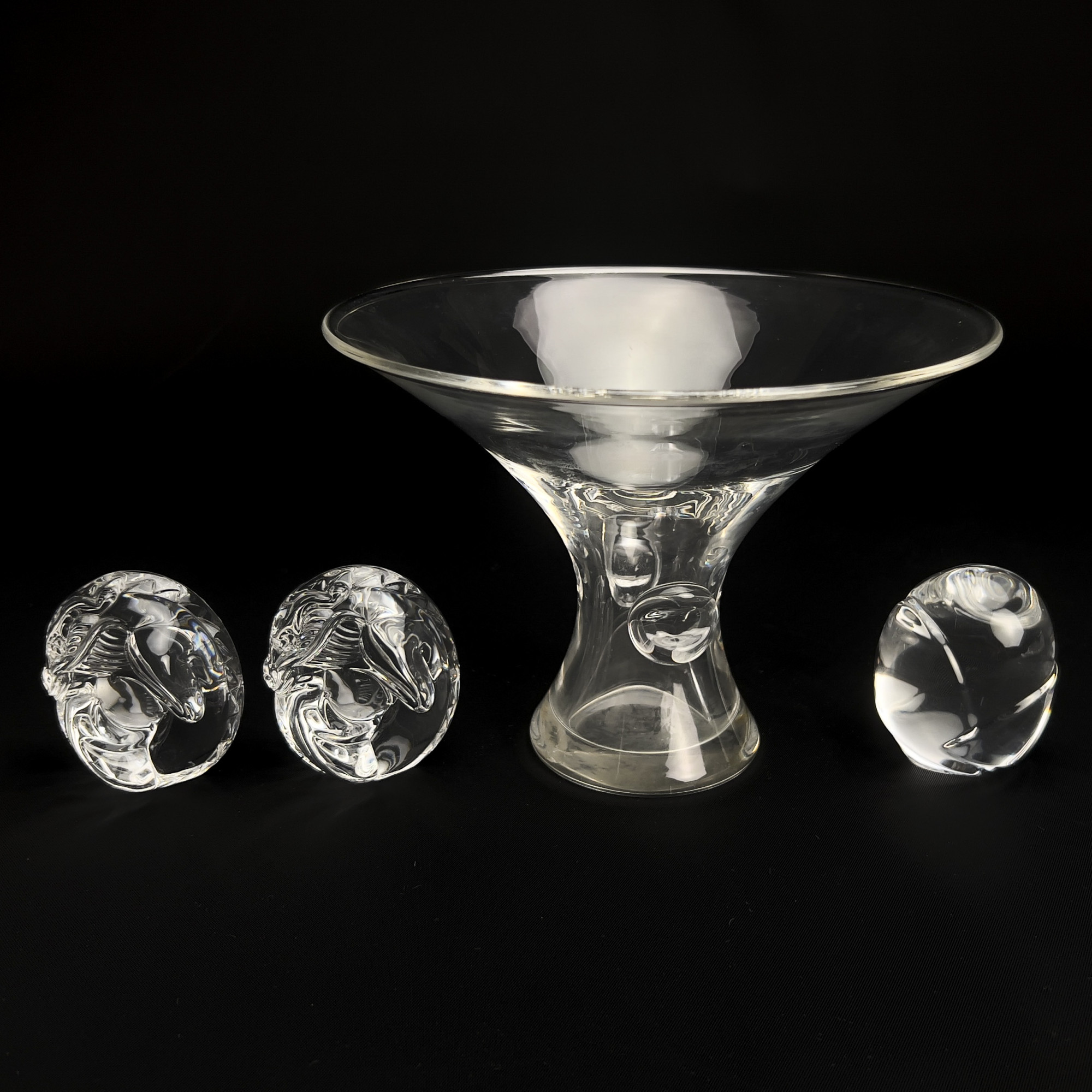Steuben glass group, comprising of a clear glass bouquet vase, and three crystal hand coolers, two dragons and one owl.