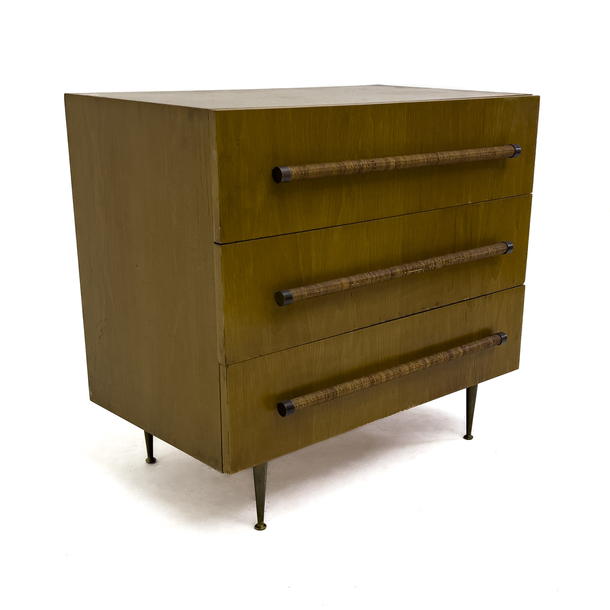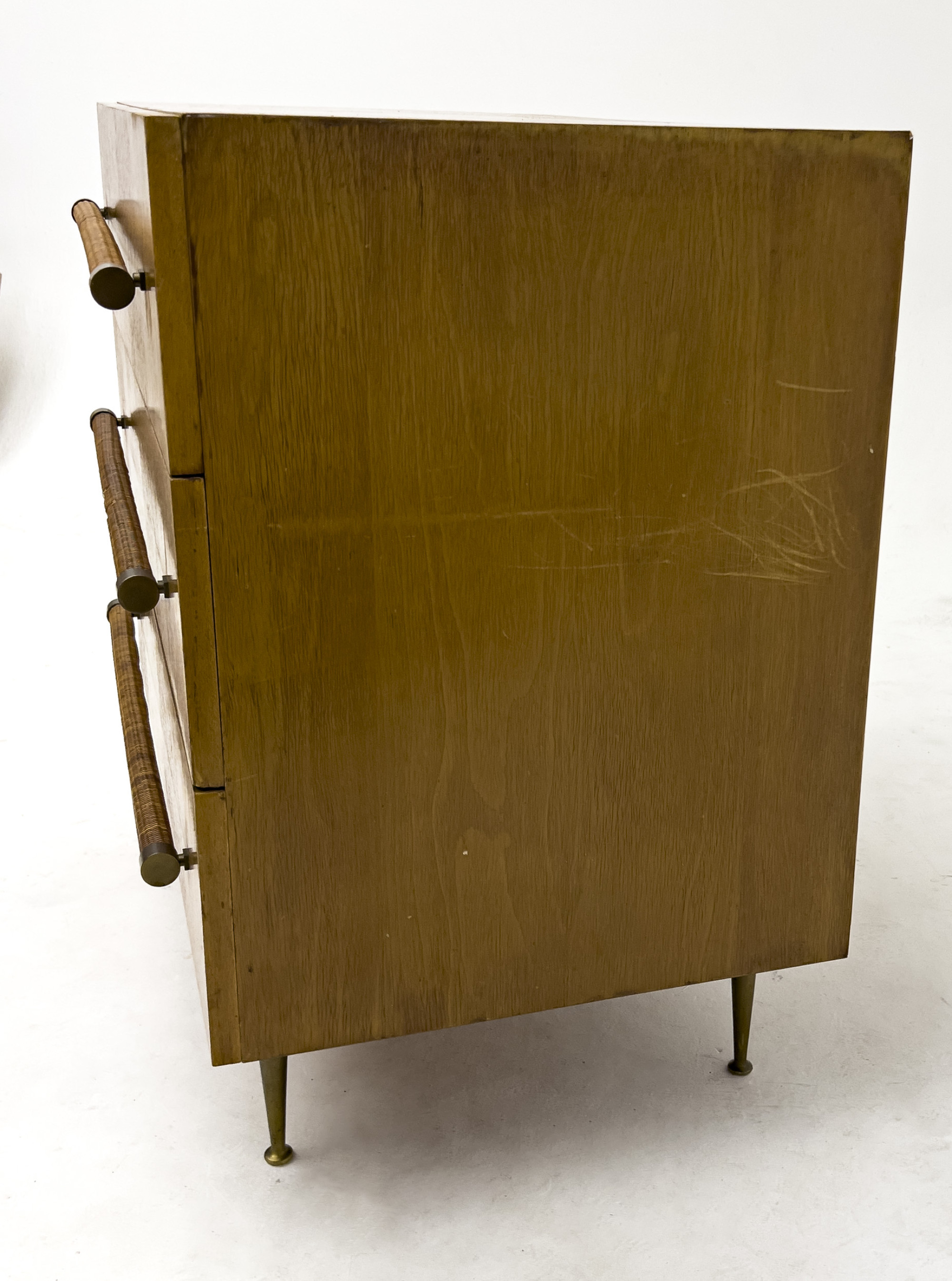 Cabinet on brass legs, fitted with three drawers with wicker wrapped pulls by T. H. Robsjohn-Gibbings for Widdicomb