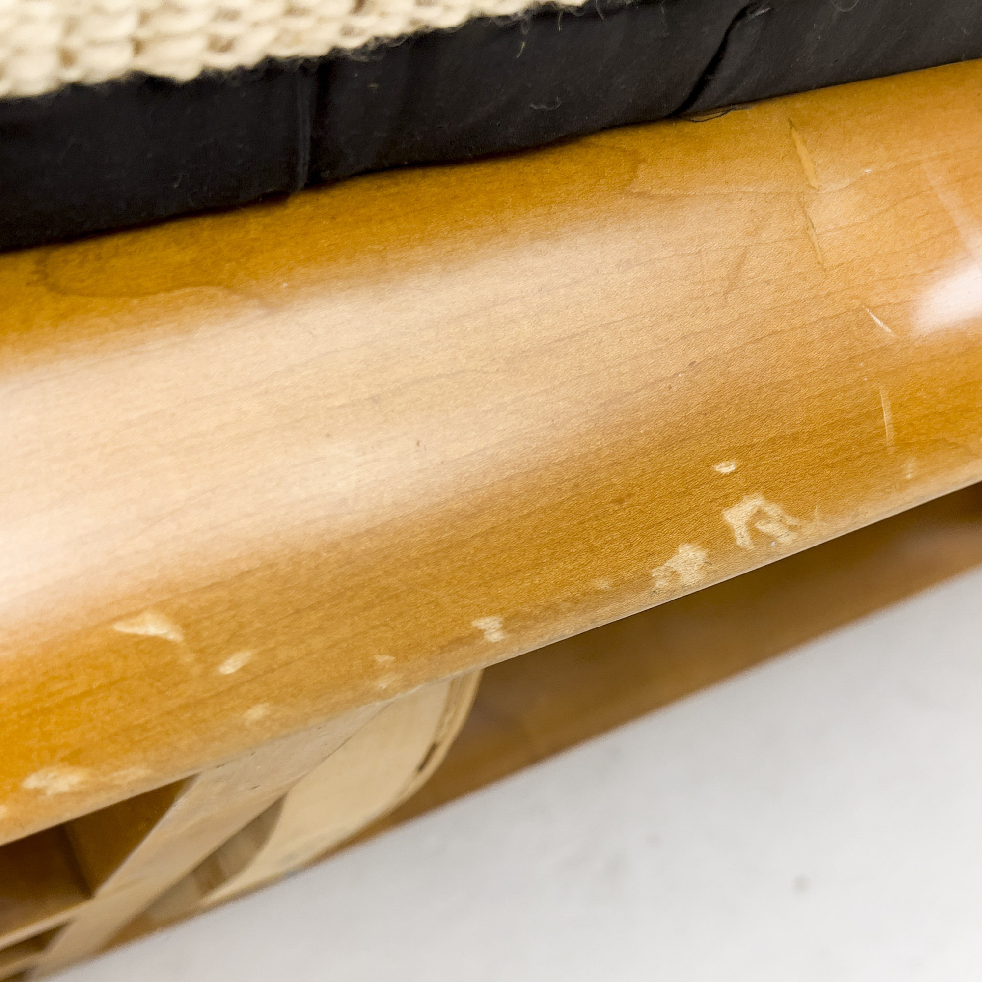 a vintage day bed set on a blonde wood frame raised on black metal legs