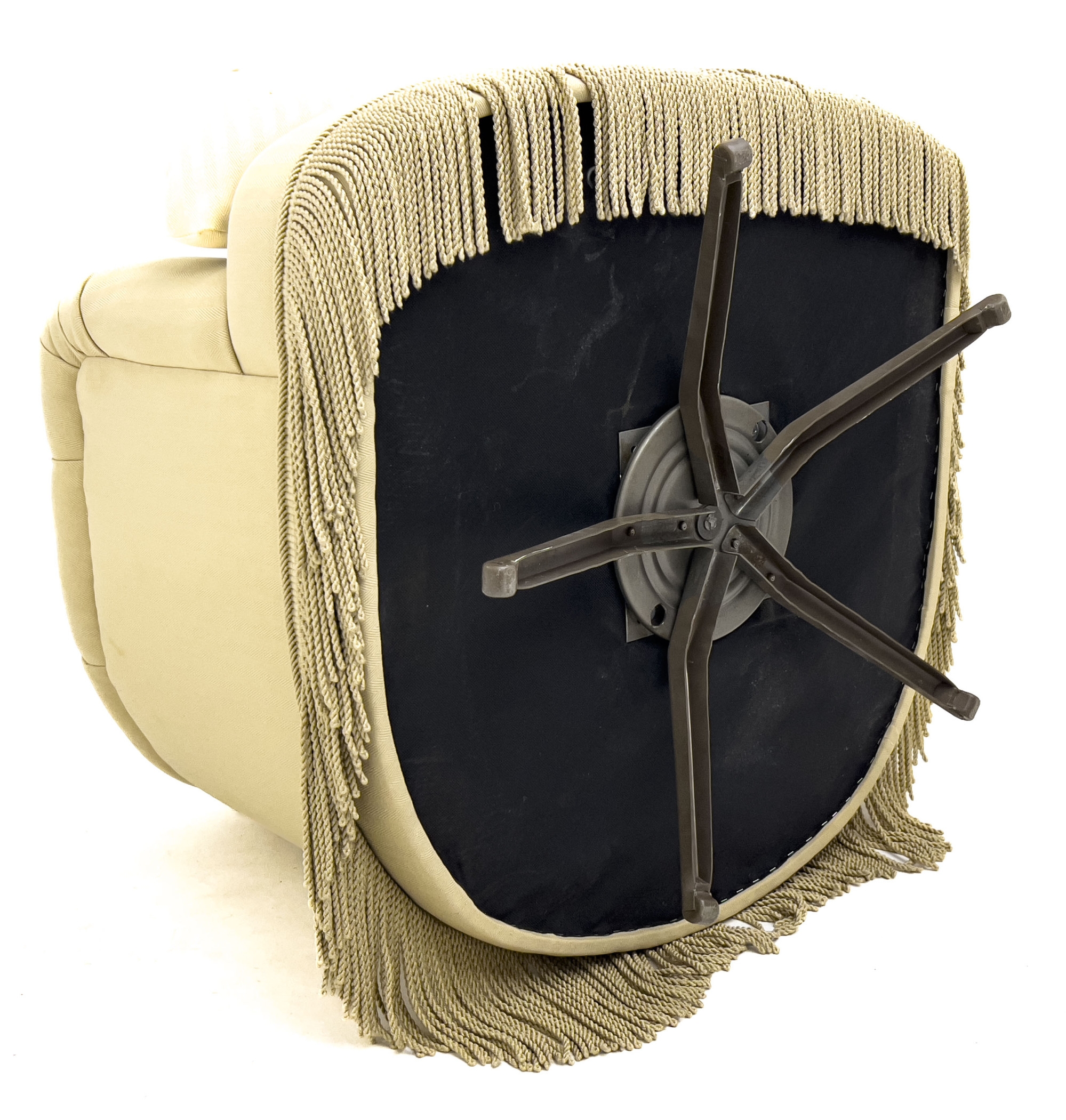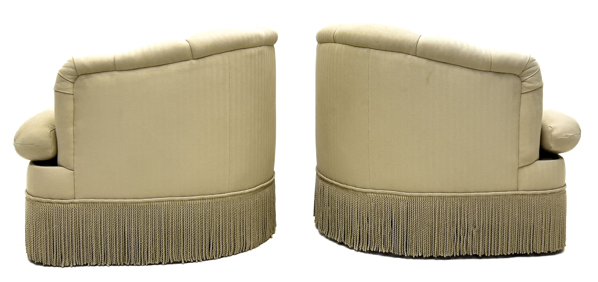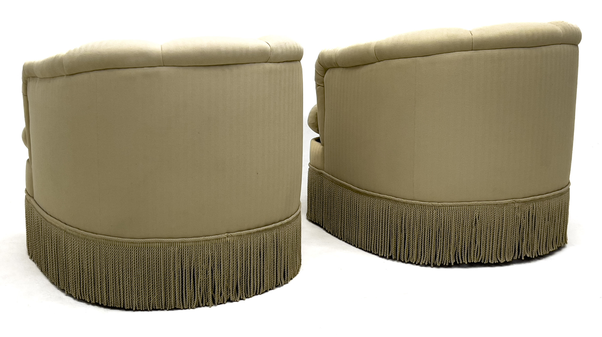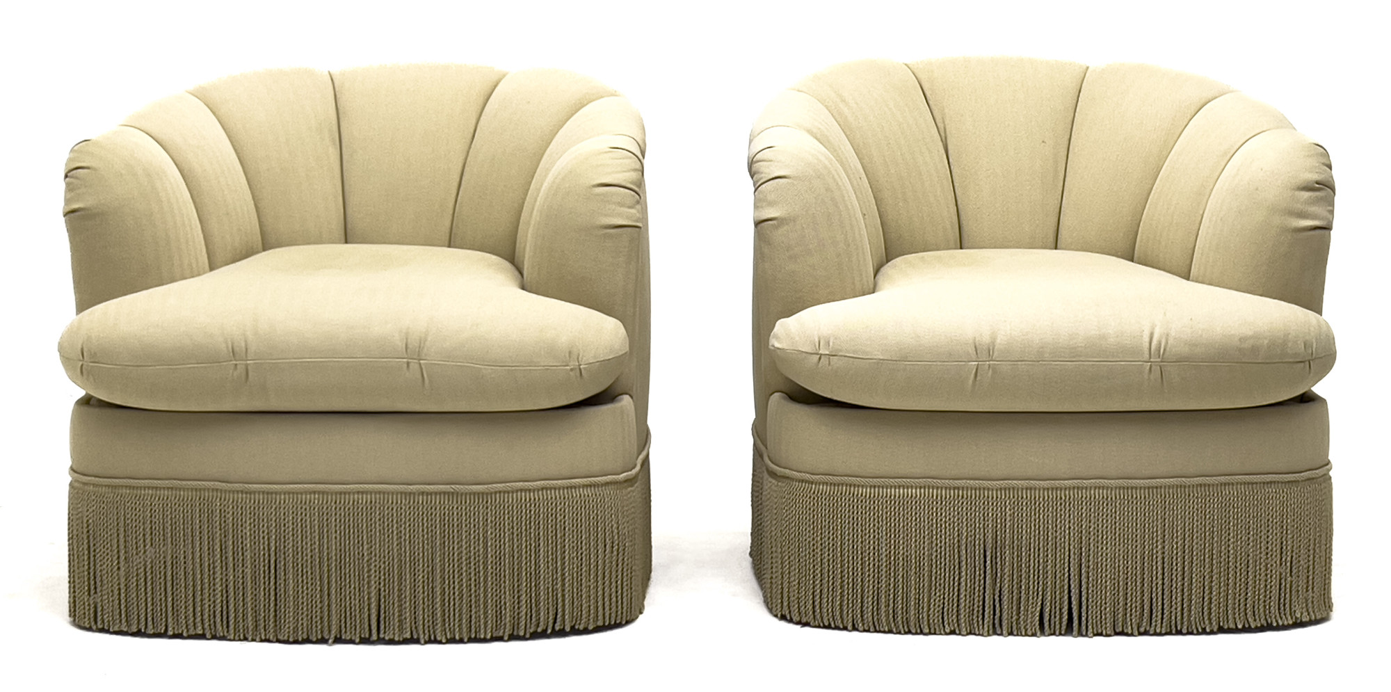 Pair of tan club swivel chairs with channel back design and mop fringe