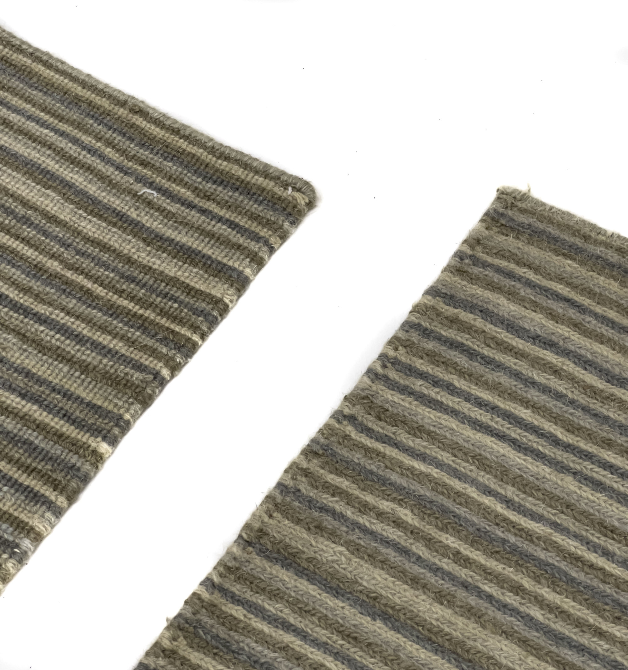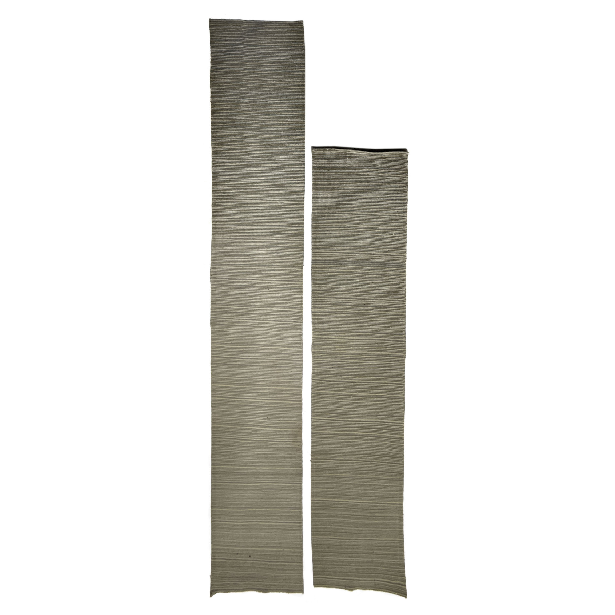 Two runners, each with horizontal stripe in shades of gray and beige, one longer,