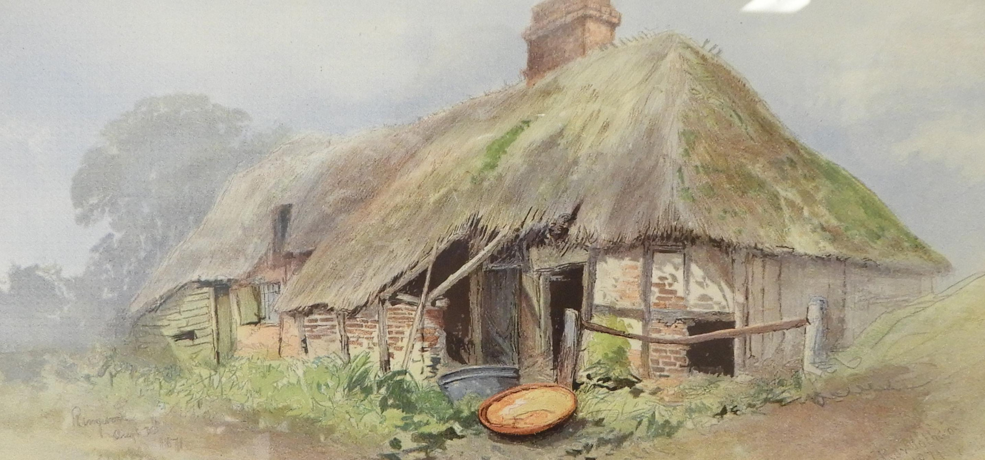 Thomas Charles Leeson Rowbotham (British, 1823 - 1875). Watercolor, ink, and graphite depiction of homestead, titled Ringwood and dated August 30th, 1871 lower left, signed and dated lower right. Provenance label verso.
