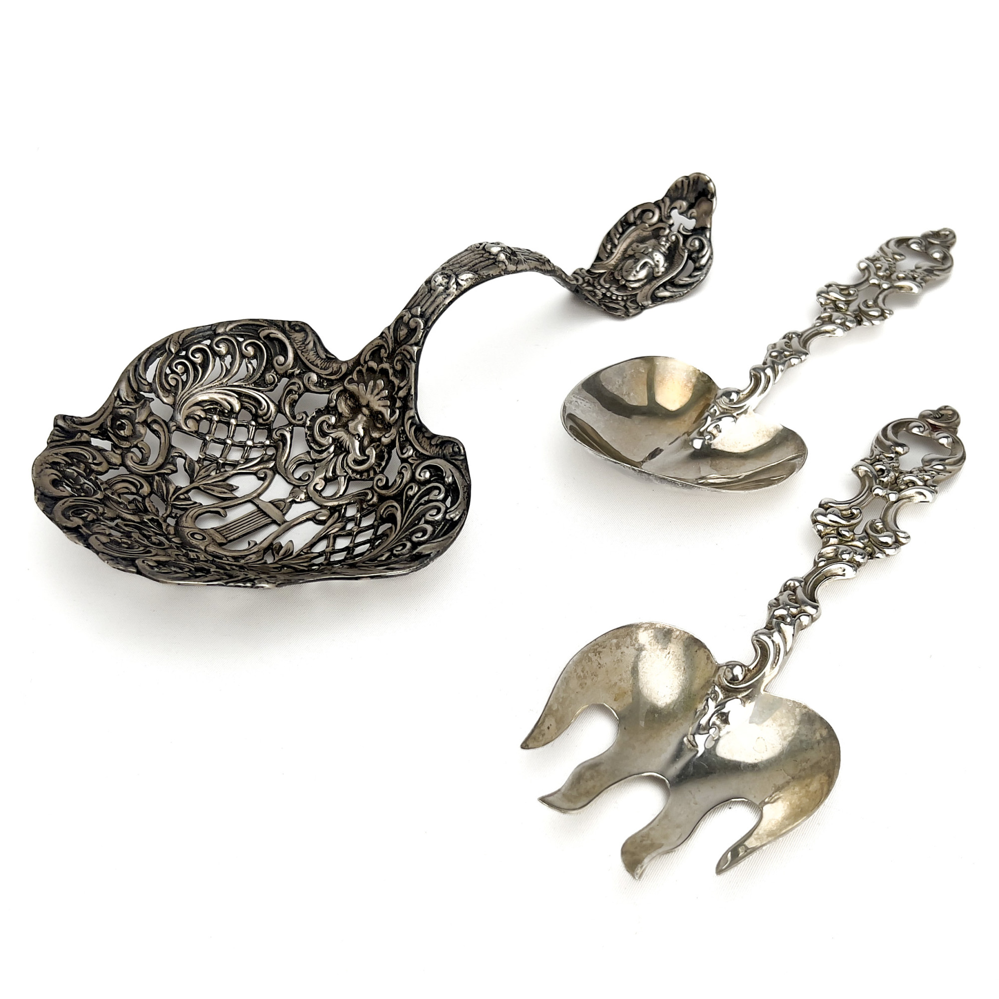 Sterling silver group, comprising of one large reticulated serving spoon, and a serving set with ornate carved handles