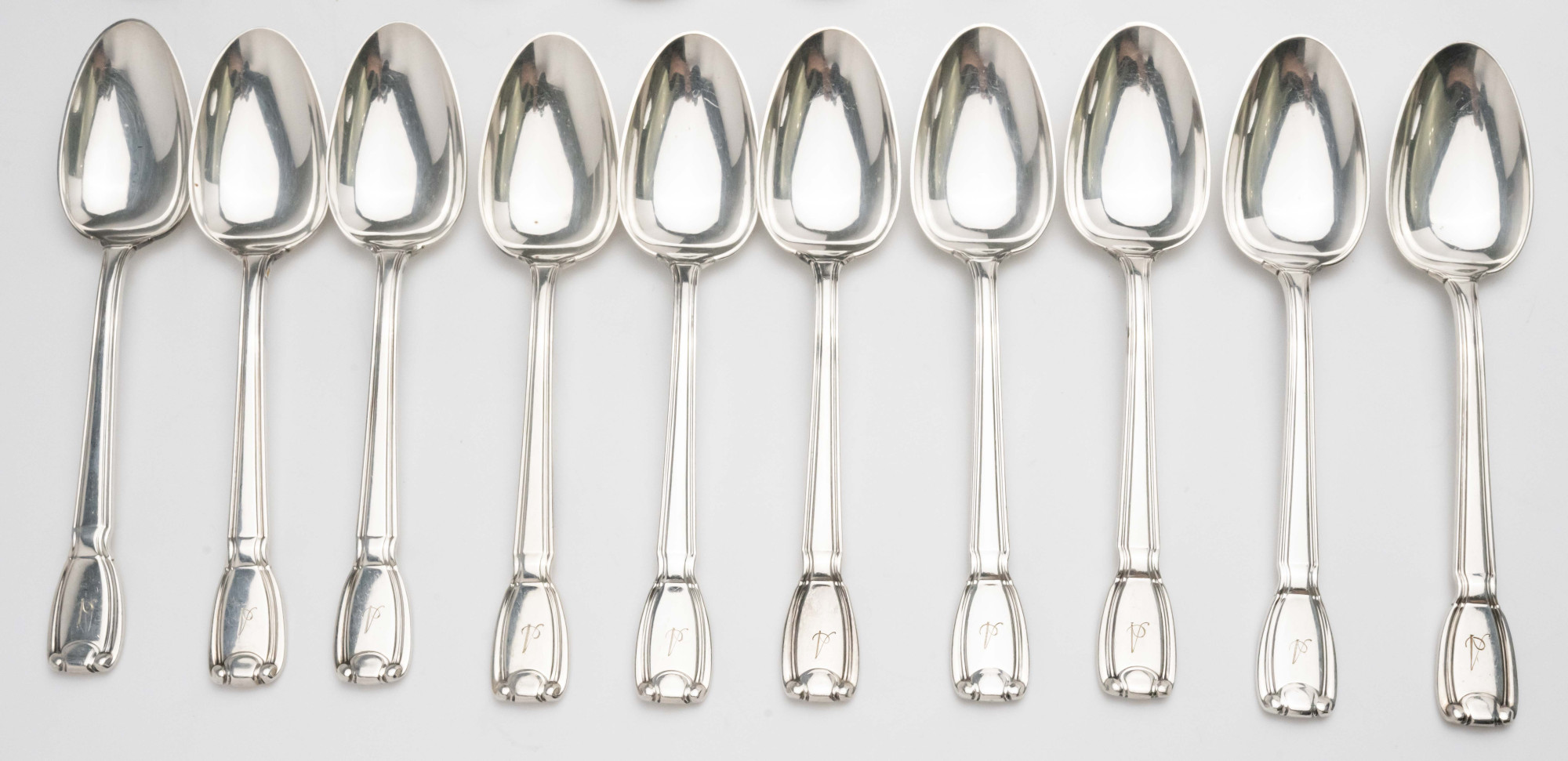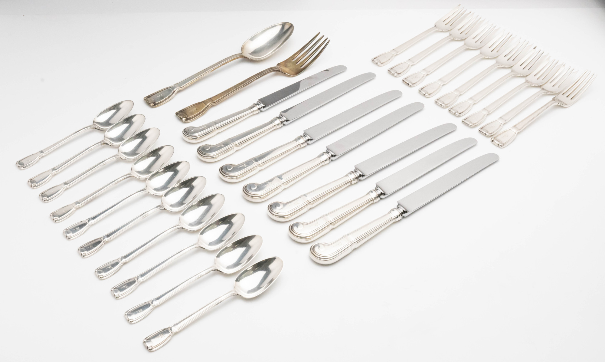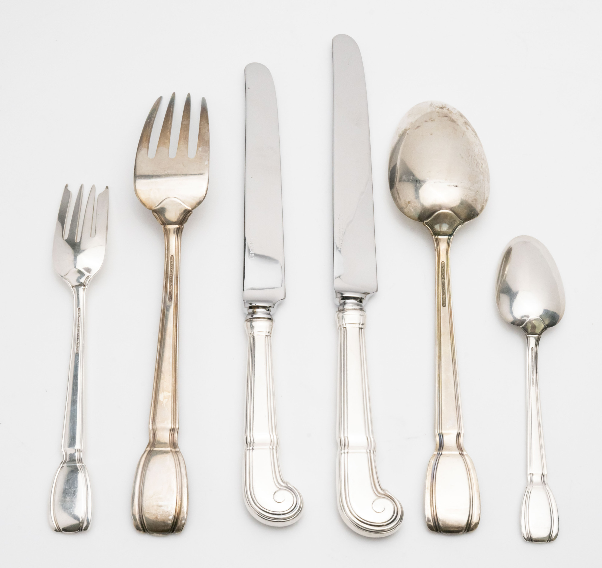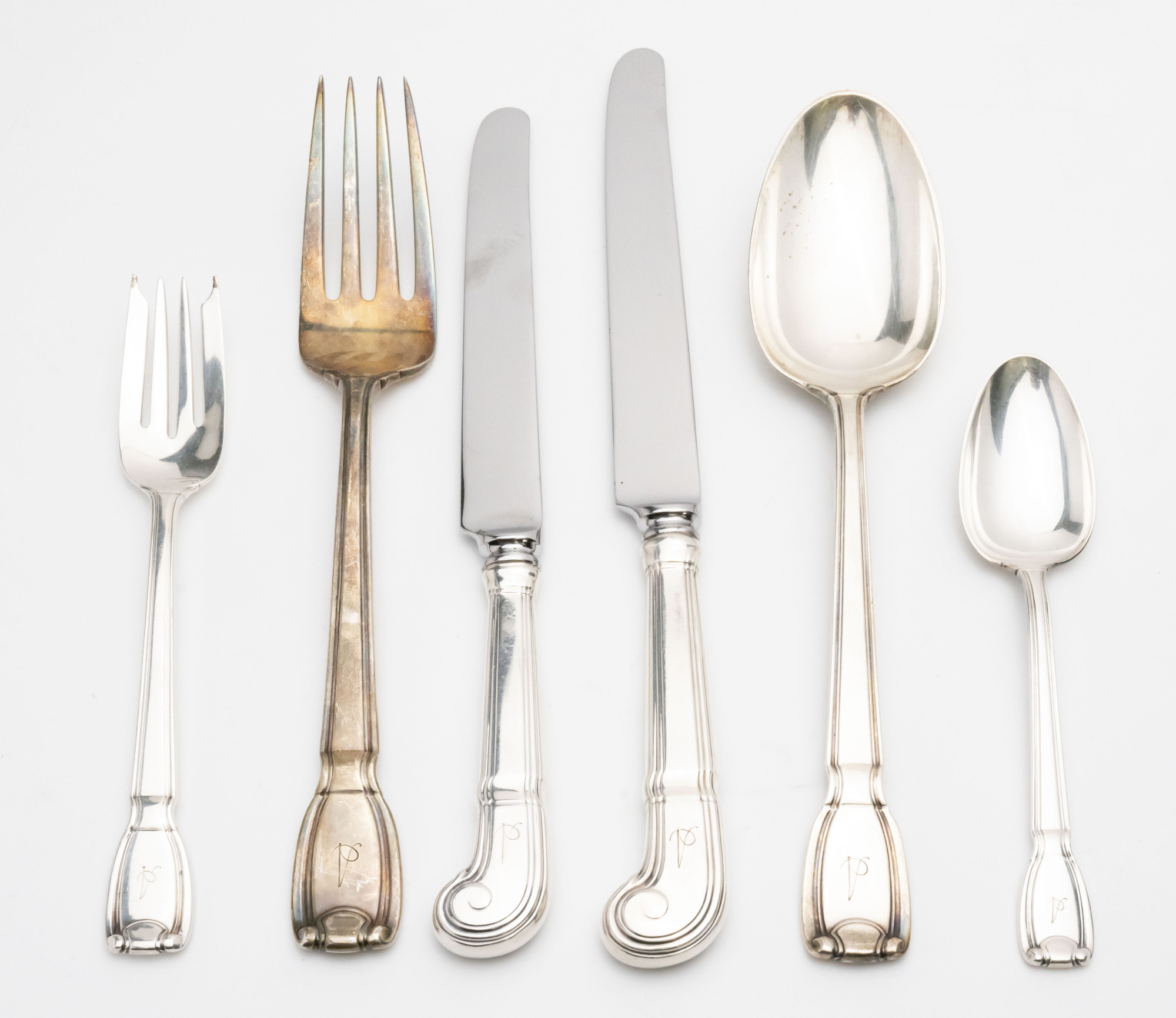 28 total pieces including: (10) tea spoons, (1) dinner fork, (8) dessert forks, (6) dinner knives, (1) luncheon knife, (1) serving spoon, (1) serving fork