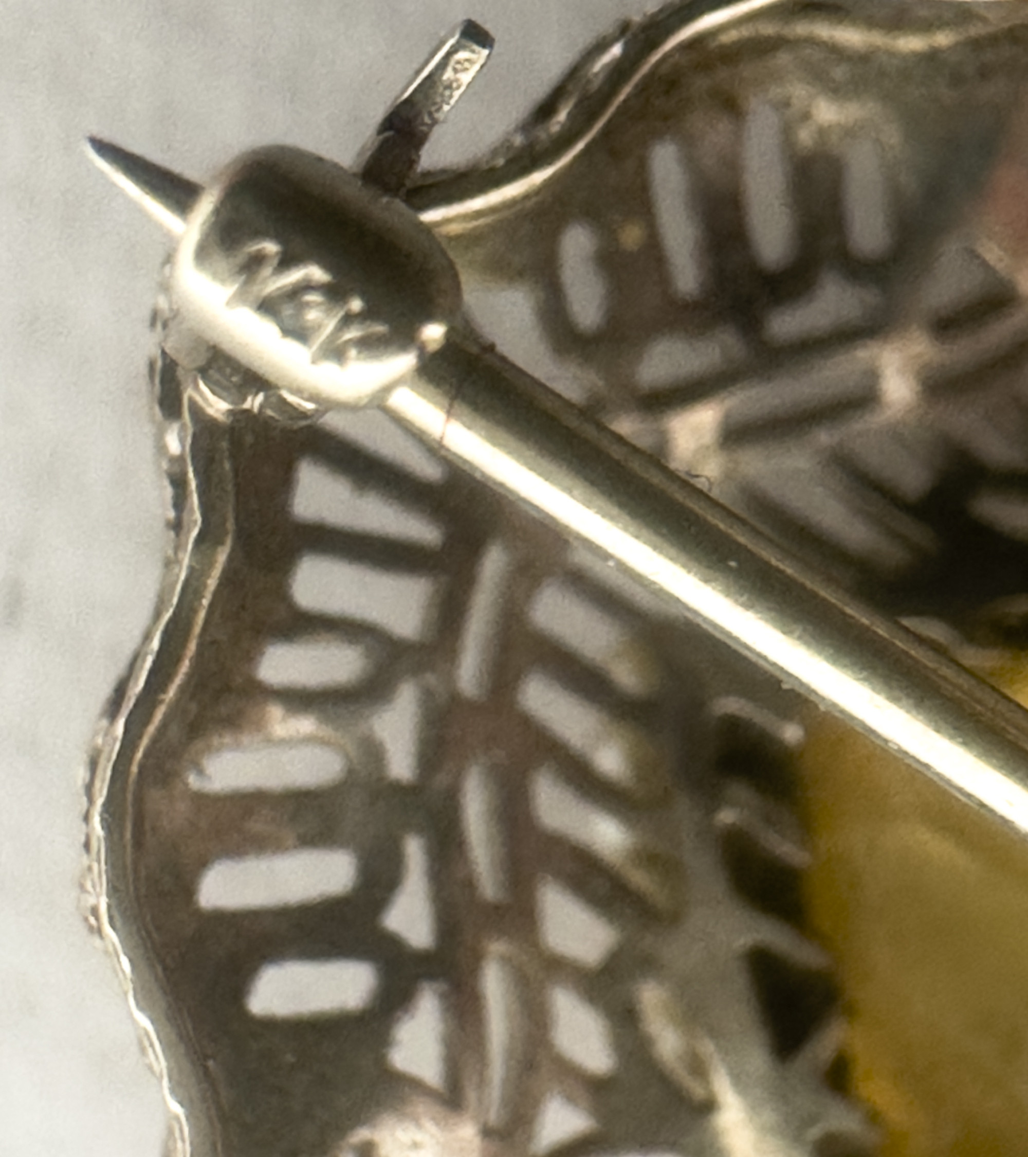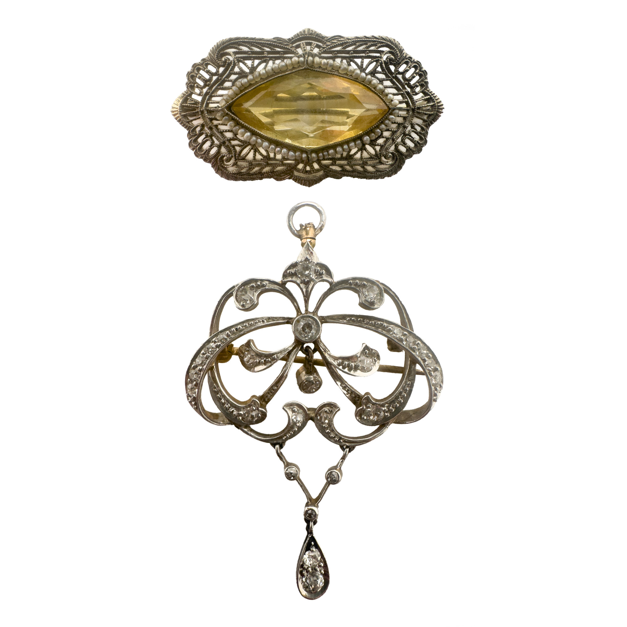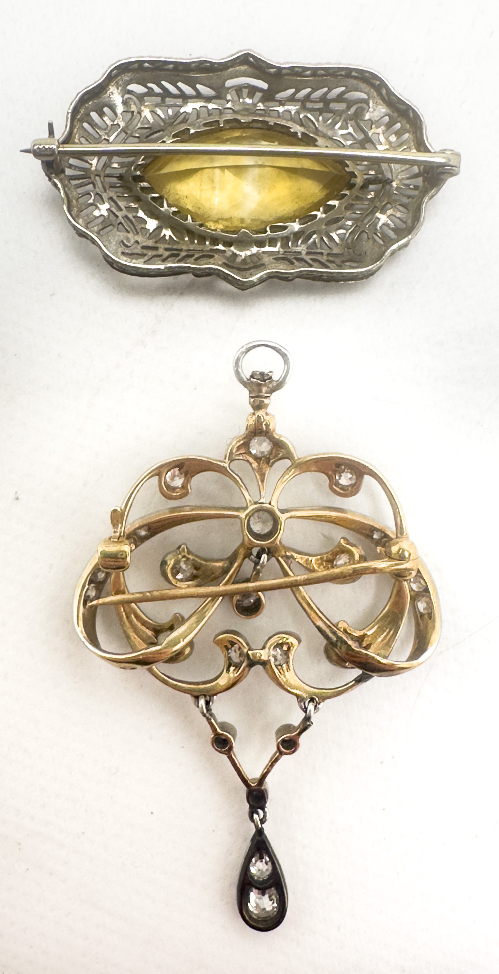 and pendant brooch with approximately 25 diamonds ranging from 1 mm to 2 mm in diameter, tested for 14K gold