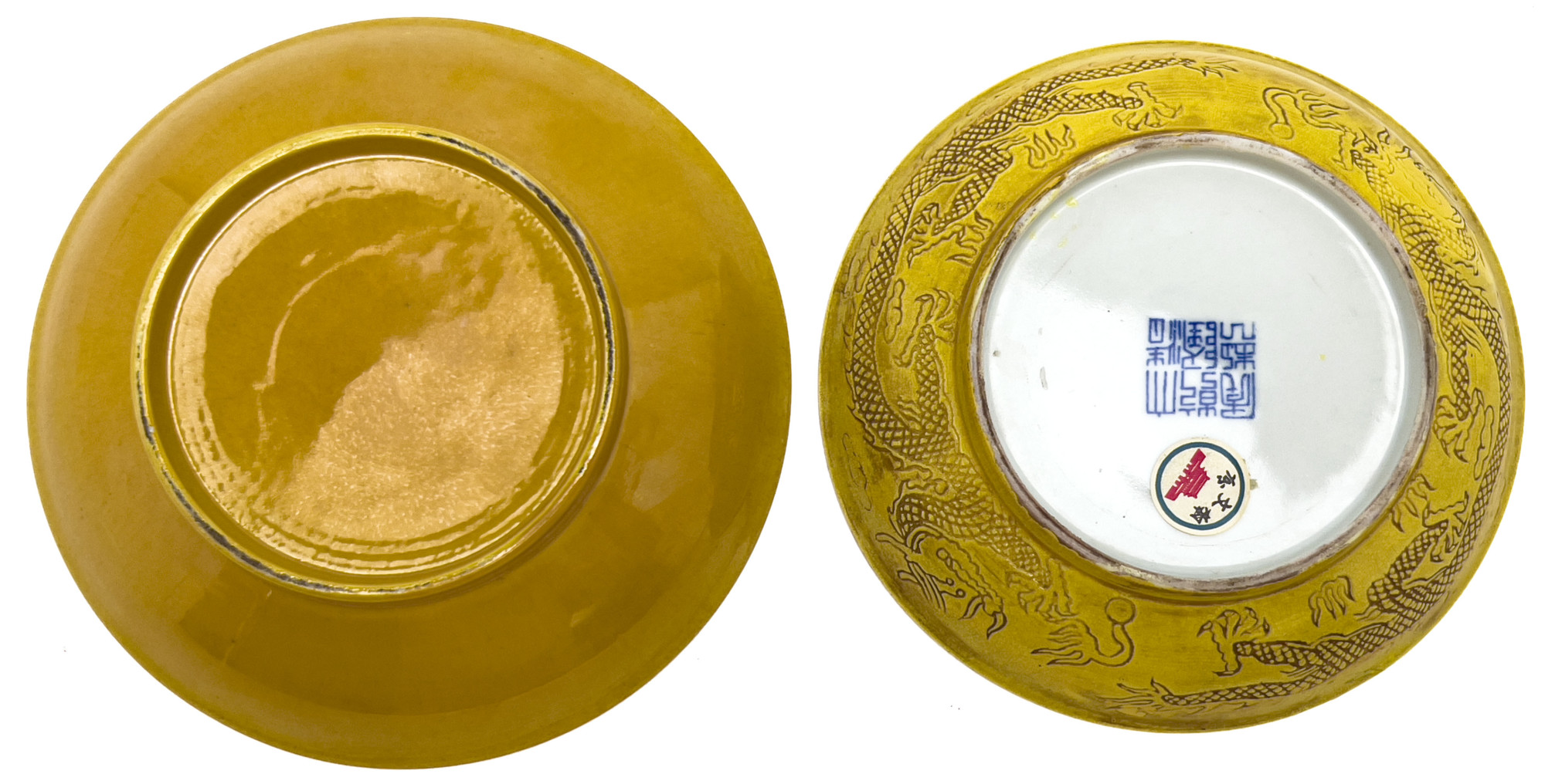 Comprising yellow glazed shallow bowl with dragon designs incised to interior and exterior, along with yellow glazed shallow bowl