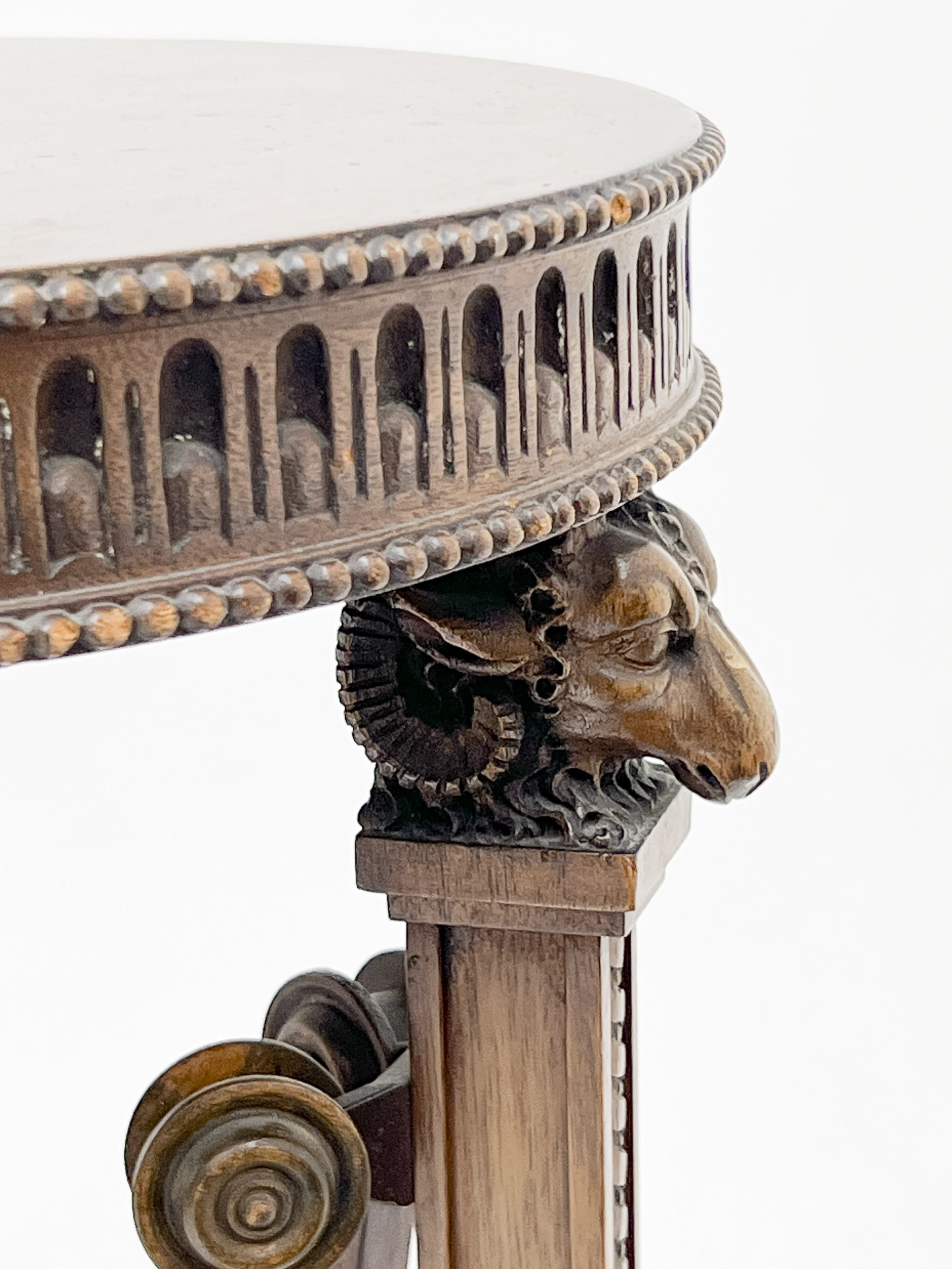 comprising mahogany oval table with basket, mahogany pedestal tripod table, and empire style pedestal with brass mountings