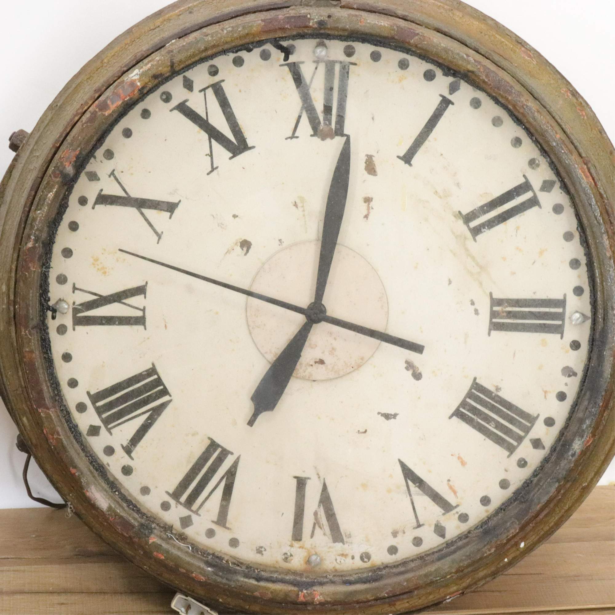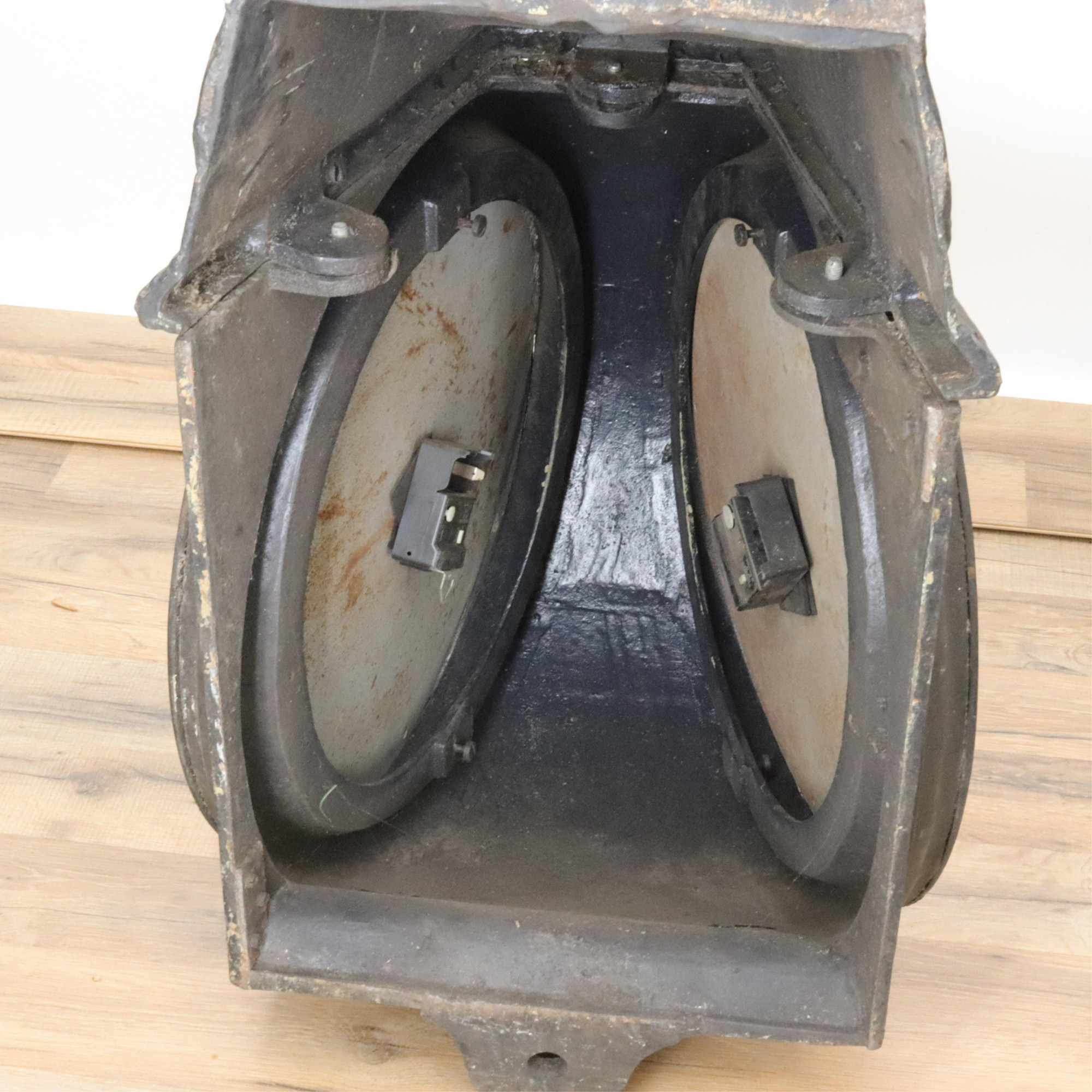 Painted dial faces. Lepaute dials, set at angle to each other, in black painted iron base, very heavy in weight. No internal movements to either (battery movement to each side currently). Pocketwatch form with glass, hour and minute hands to one side; old plug-in wiring.