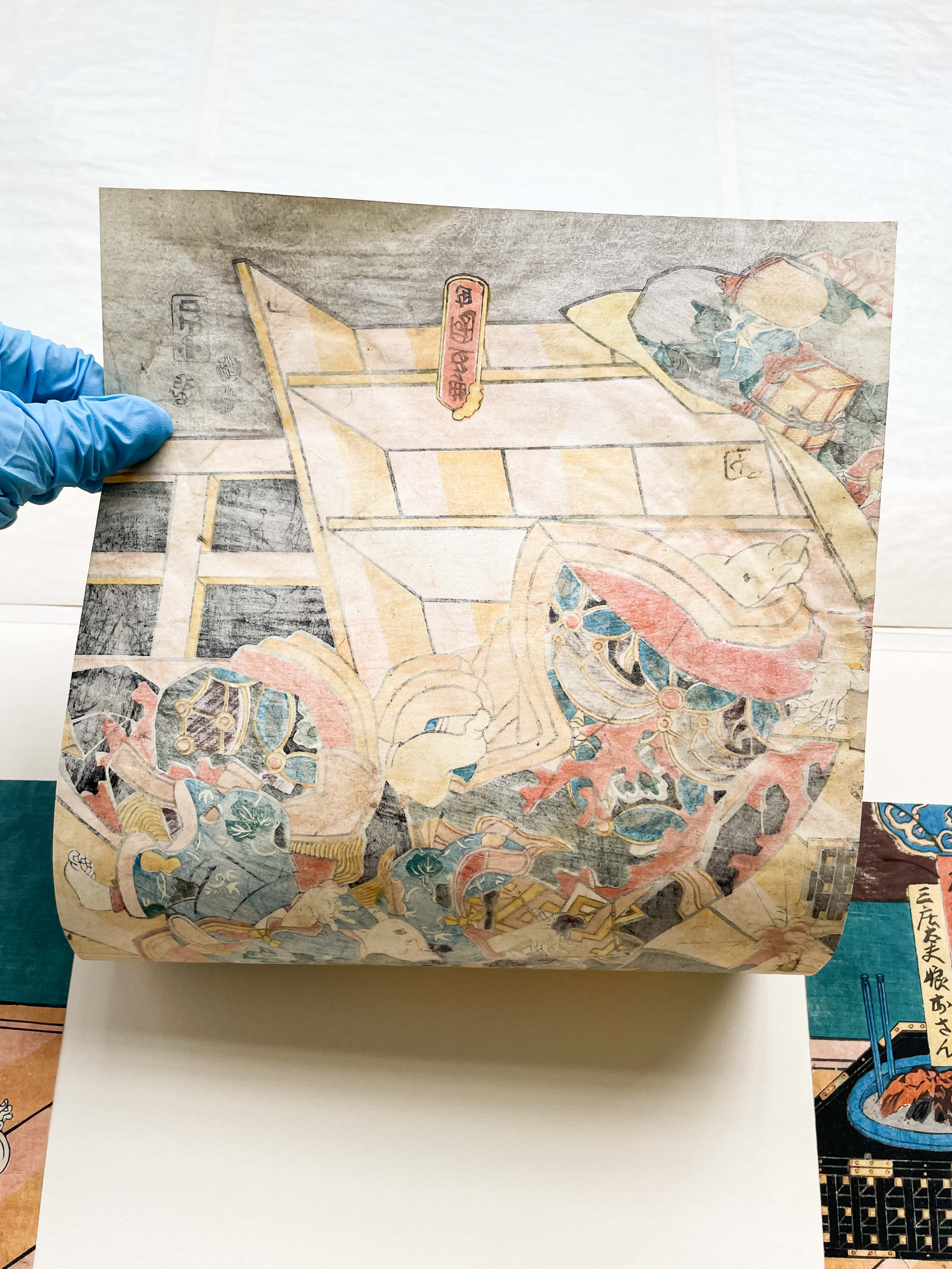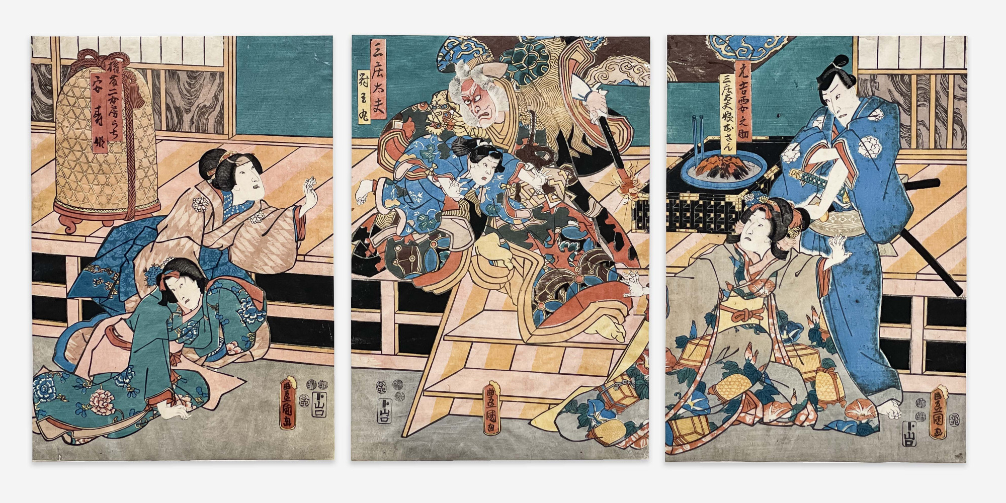 overall good condition, area of restoration to right most image, minor wormholes to upper right edge of central image, minor areas of staining to each, hinged along upper edge,