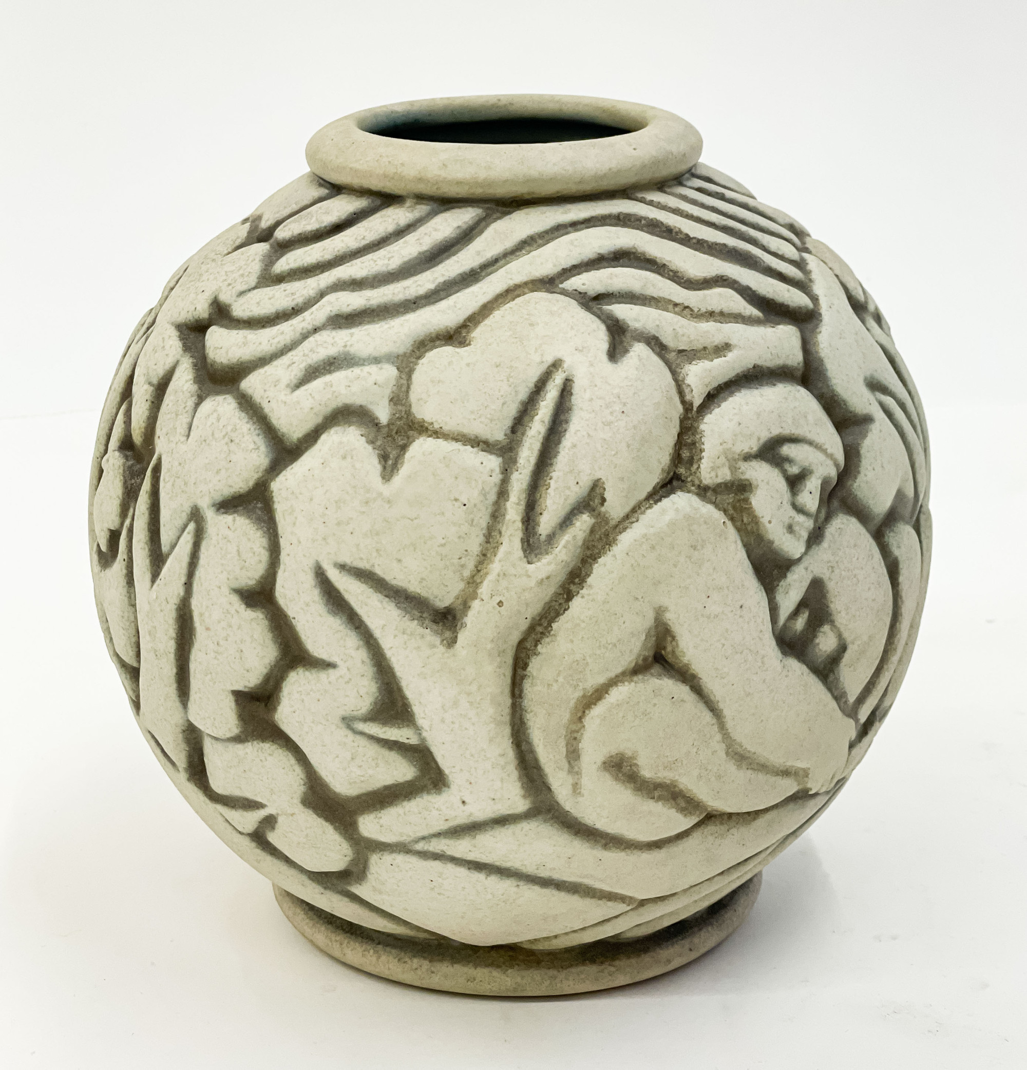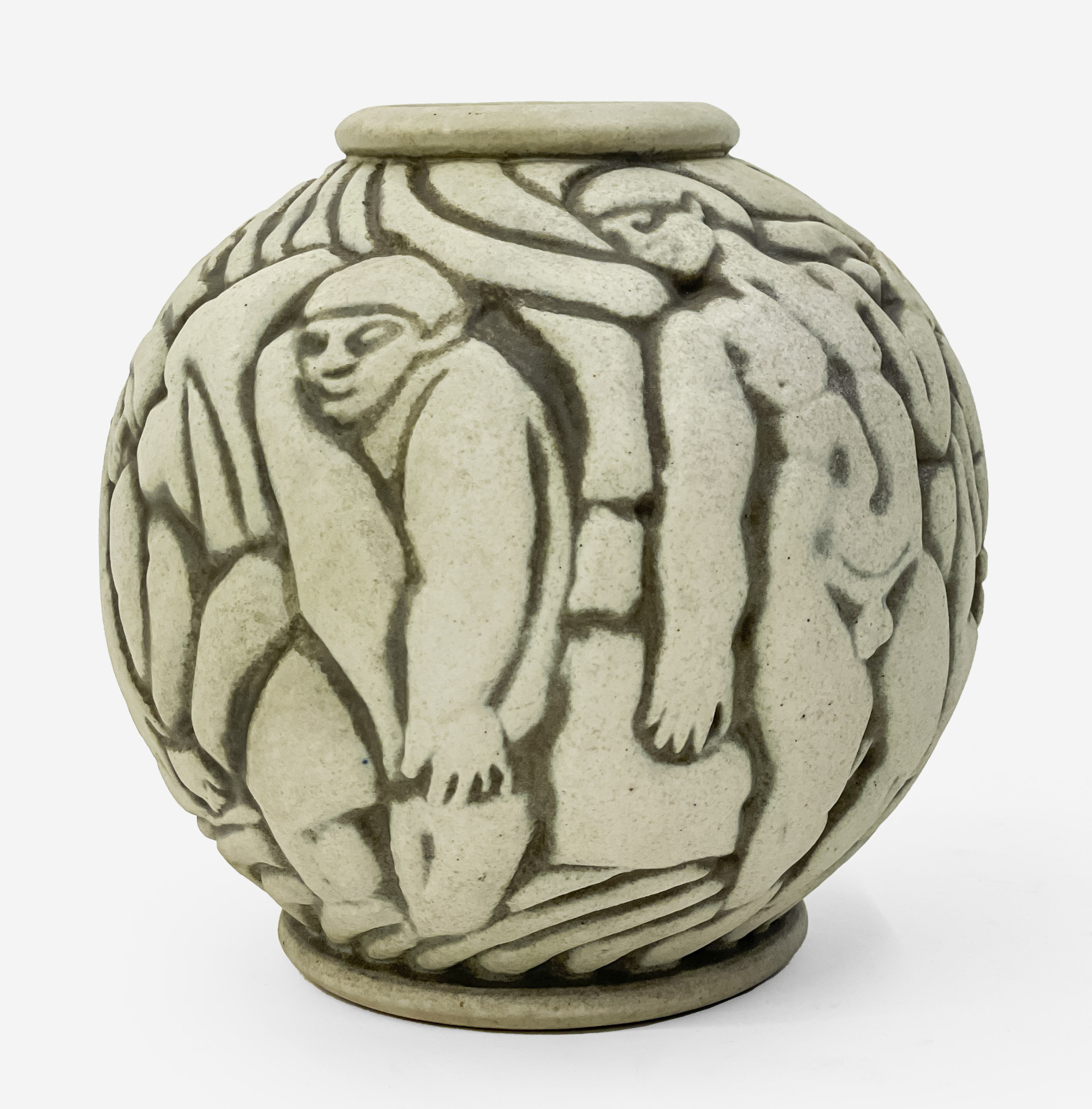 cast spherical ceramic vase depicting nude figures on edge of a wood outside village