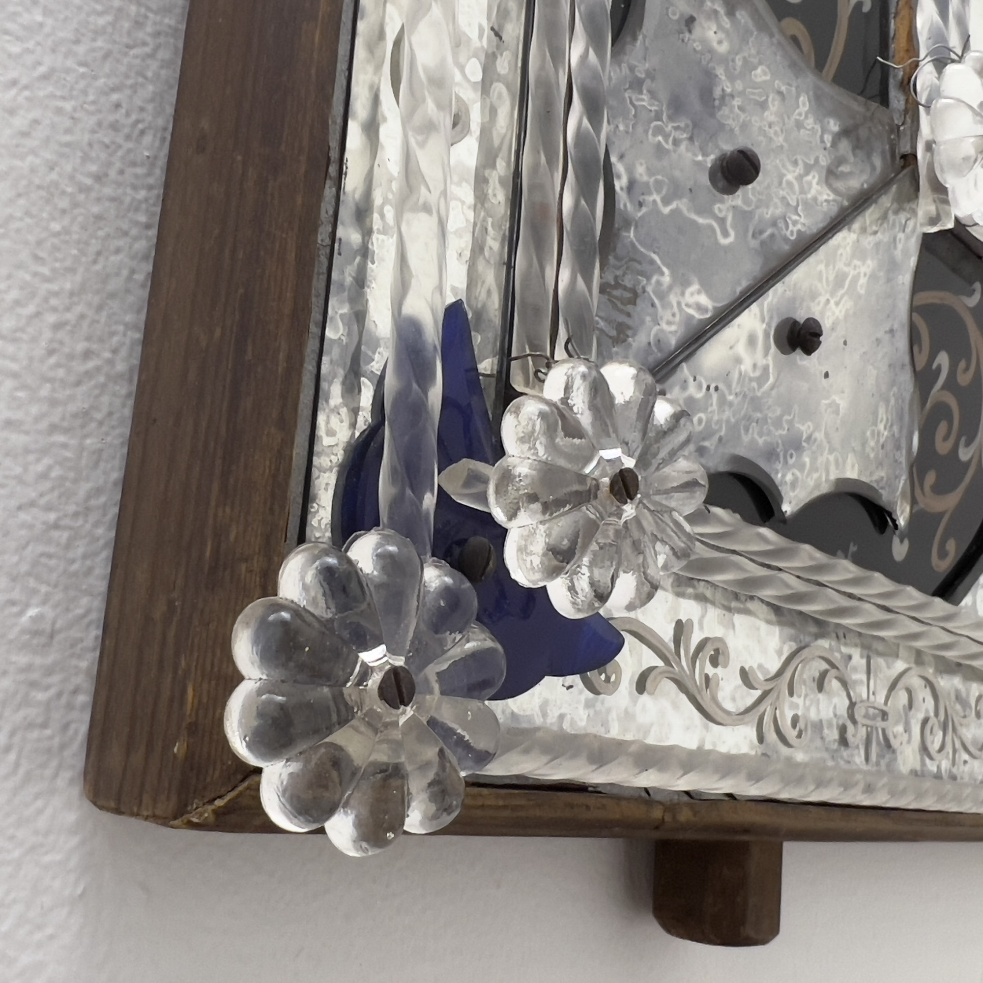 Overall good condition, one glass floral element has an old repair, one glass floral element detached, several small areas of scattered desilvering.