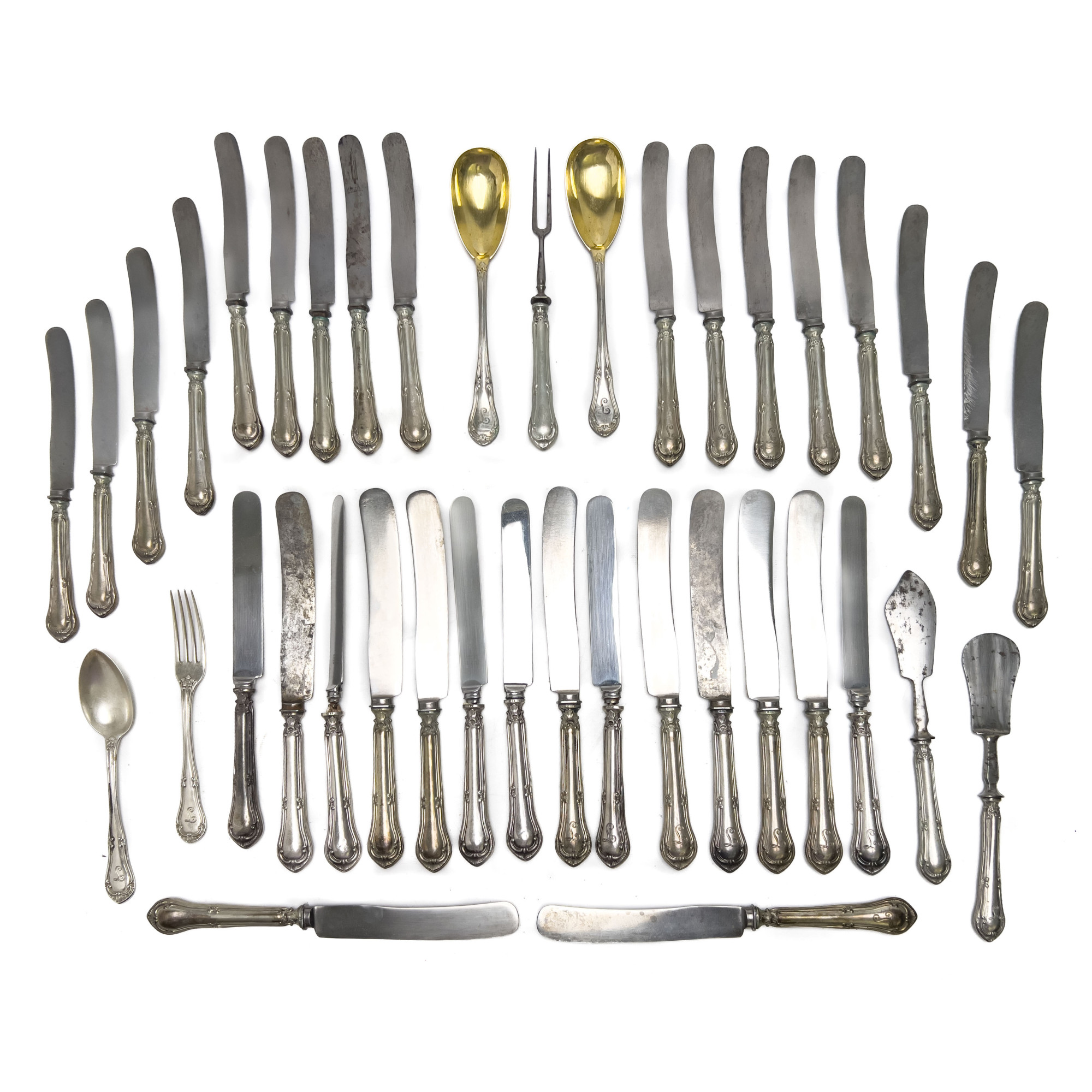 Comprising 33 knives, 1 meat fork, and 2 serving pieces all 750 silver handles, and 3 750 silver spoons, and a 750 silver fork