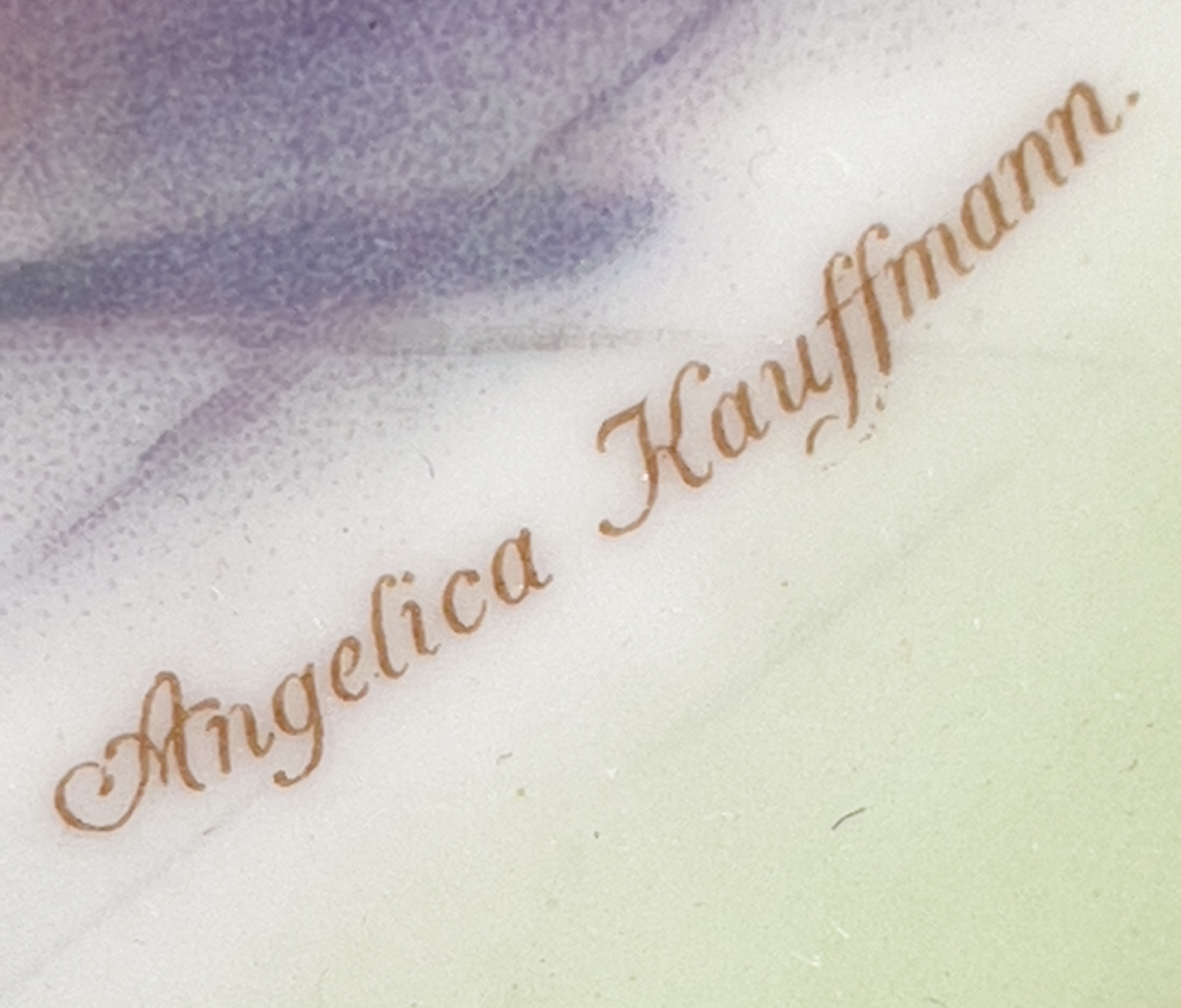 comprising two Royal Vienna plates with gilt rims and decoration, decorated with scenes after Angelics Kauffmann, hanging mechanism to backs