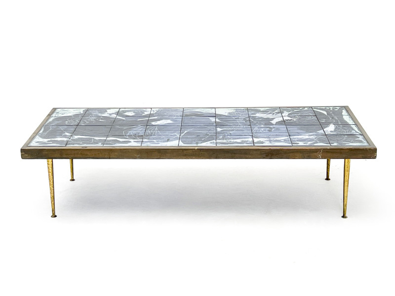 mosaic tile set into wood top with brass legs, depicting a modern style classical allegorical scene with reclining figures and fish
