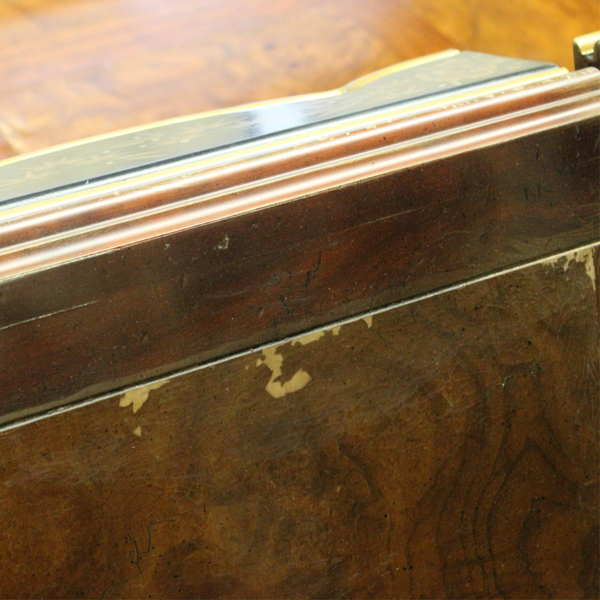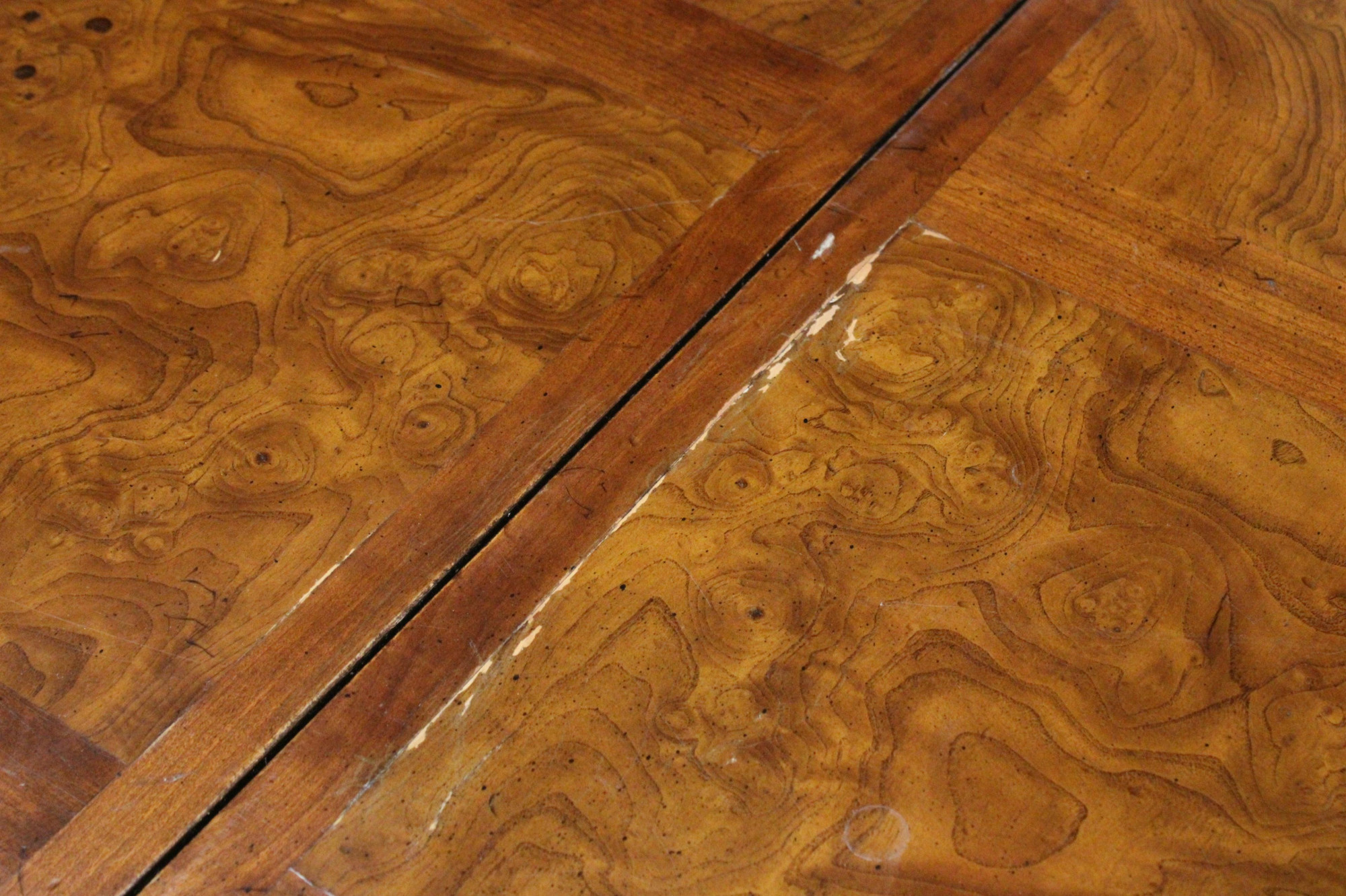 extension dining table in maple table with burl wood veneer, base lacquer painted with gold decorations, 8 chairs, table with 3 14" leaves