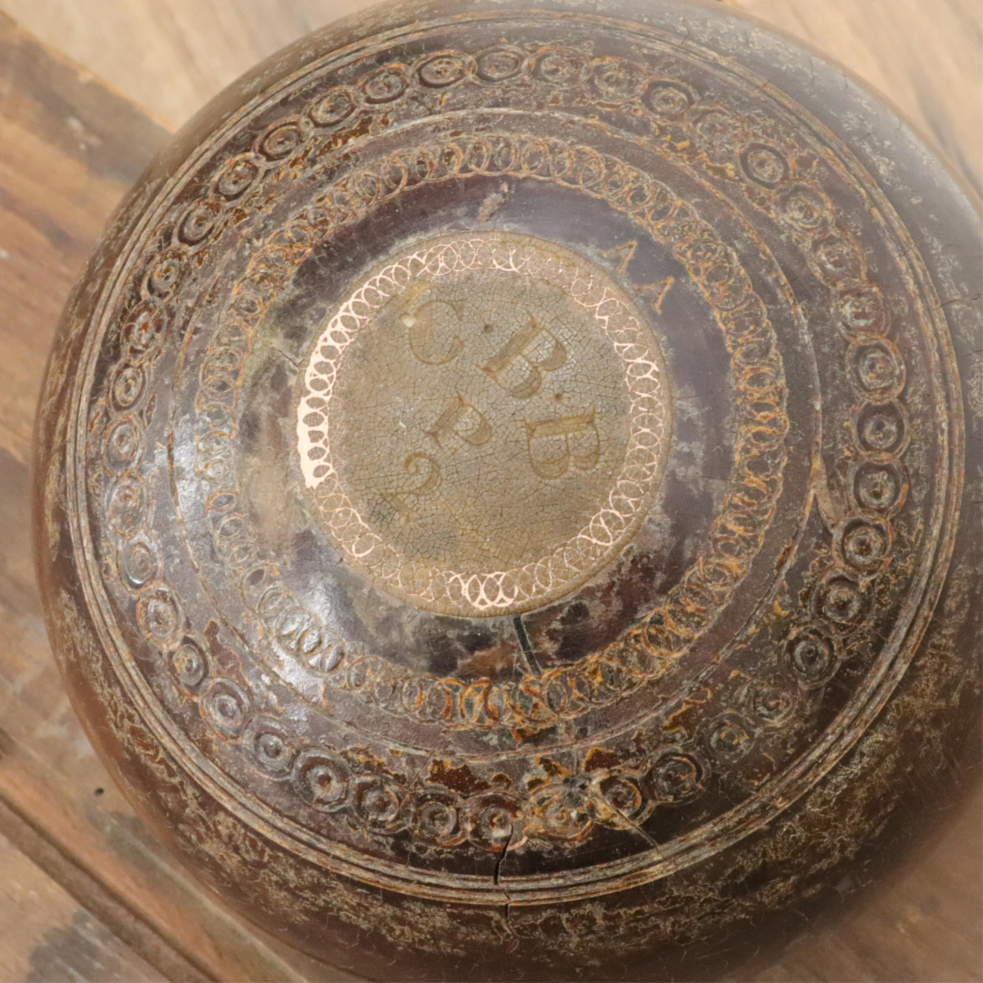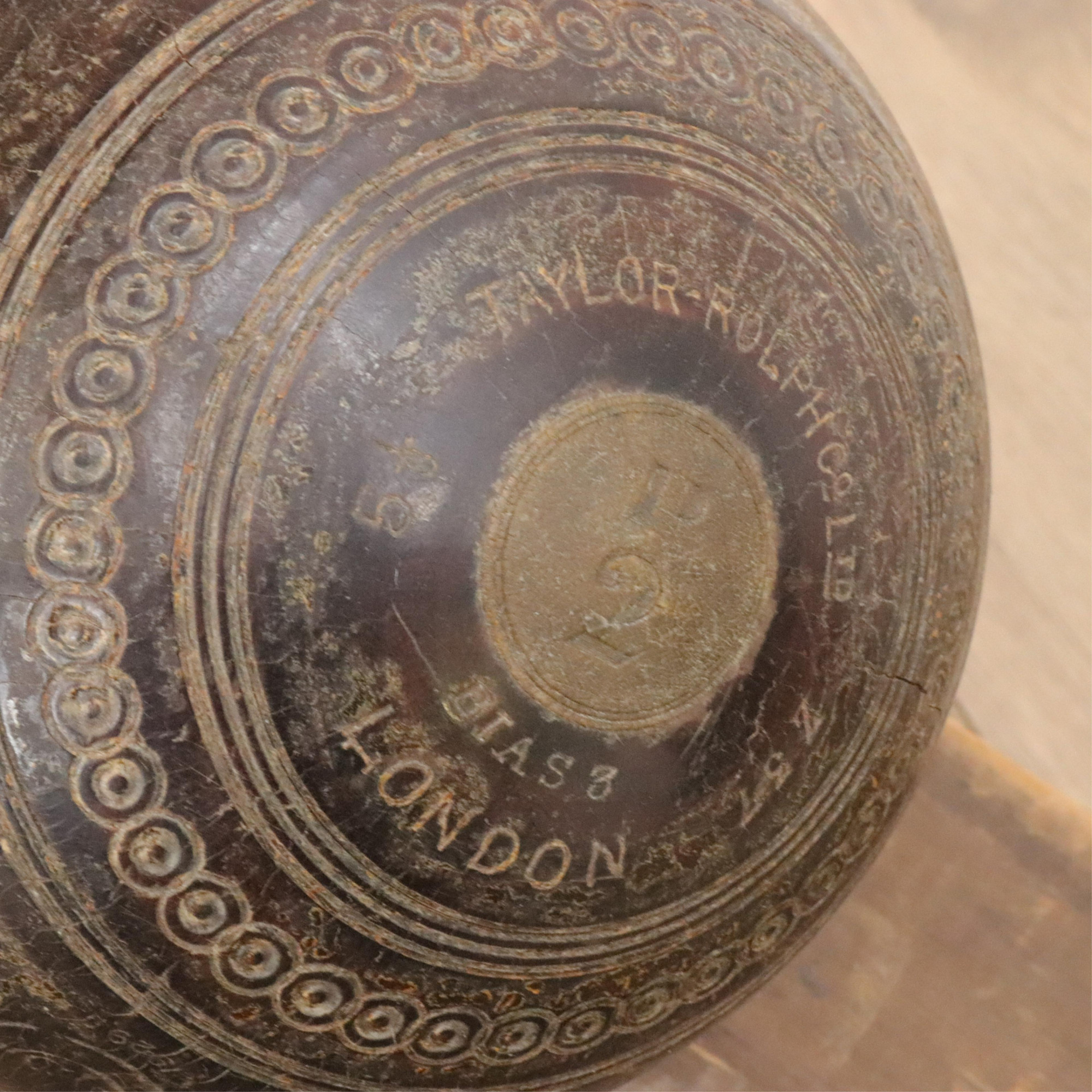 Croquet set: (7) mallets, (5) balls, (2) stakes (9)metal wickets. Polychrome paint. In old wood storage box. (8) Bocce/lawn bowling set and a Taylor-Rolph Co. London signed ball, in painted metal porch milk delivery box.