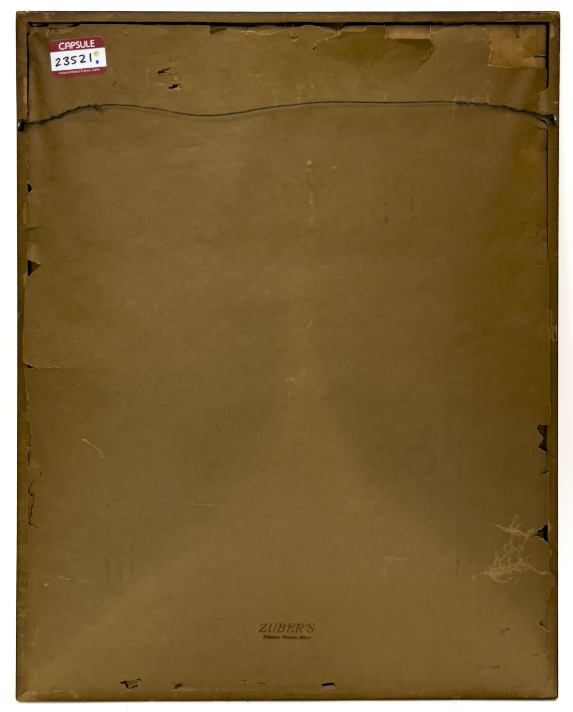 Art has not been examined out of the frame unless otherwise stated. Frames, lampshades, or items described as “supplementary” are not considered integral to the value of the lot and are excluded from condition assessments. This includes any mat, mounting, glazing, hanging apparatus, case, box, or stand. Timepiece movements, lighting elements and items with mechanical or electrical components have not been thoroughly tested and are not covered under warranty by Capsule.