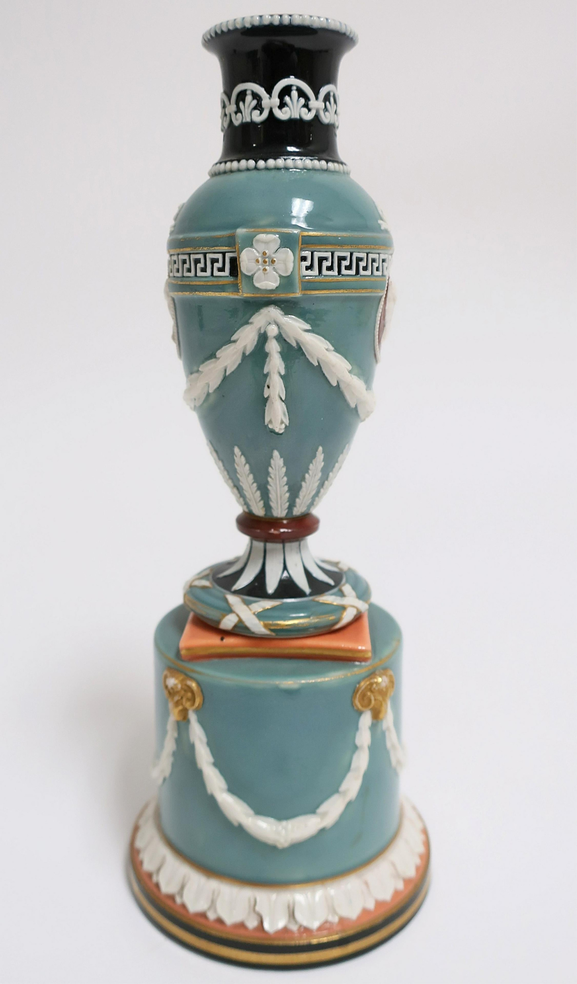 Wedgwood 5-Color Glazed Small Vase on Socle, portrait medallion, impressed mark (ZWED4462)(WT) Dimensions: 7 7/8" H x 3" Dia. Part I from a major collection of Wedgwood, Long Island, NY