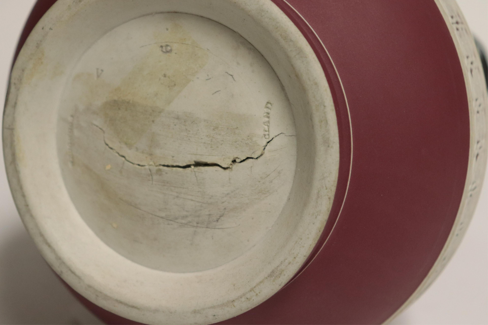 Wedgwood Crimson Jasper Dip Etruscan Jug, with impressed mark & England, applied white Classical figures in relief, pewter lid.
