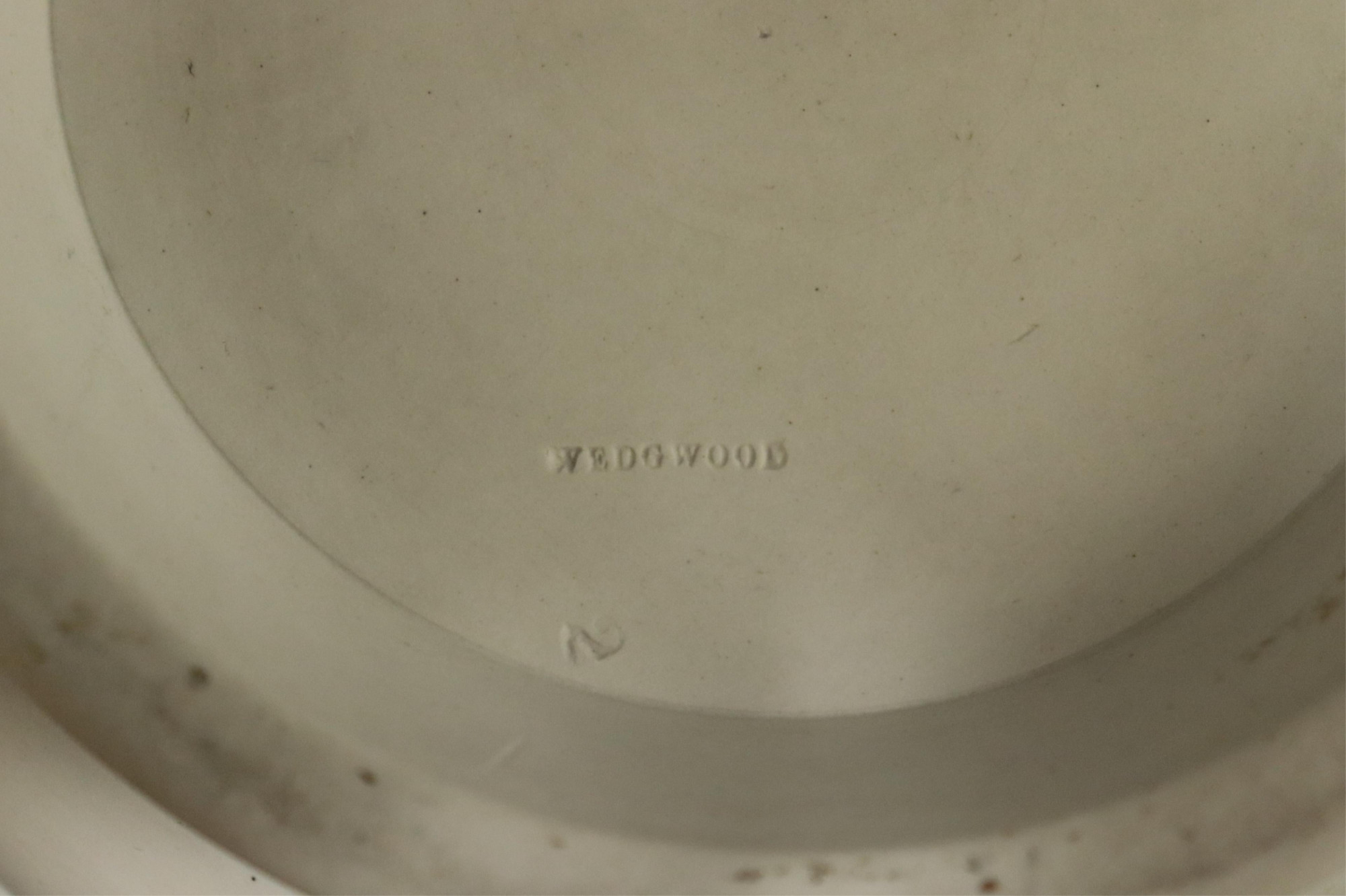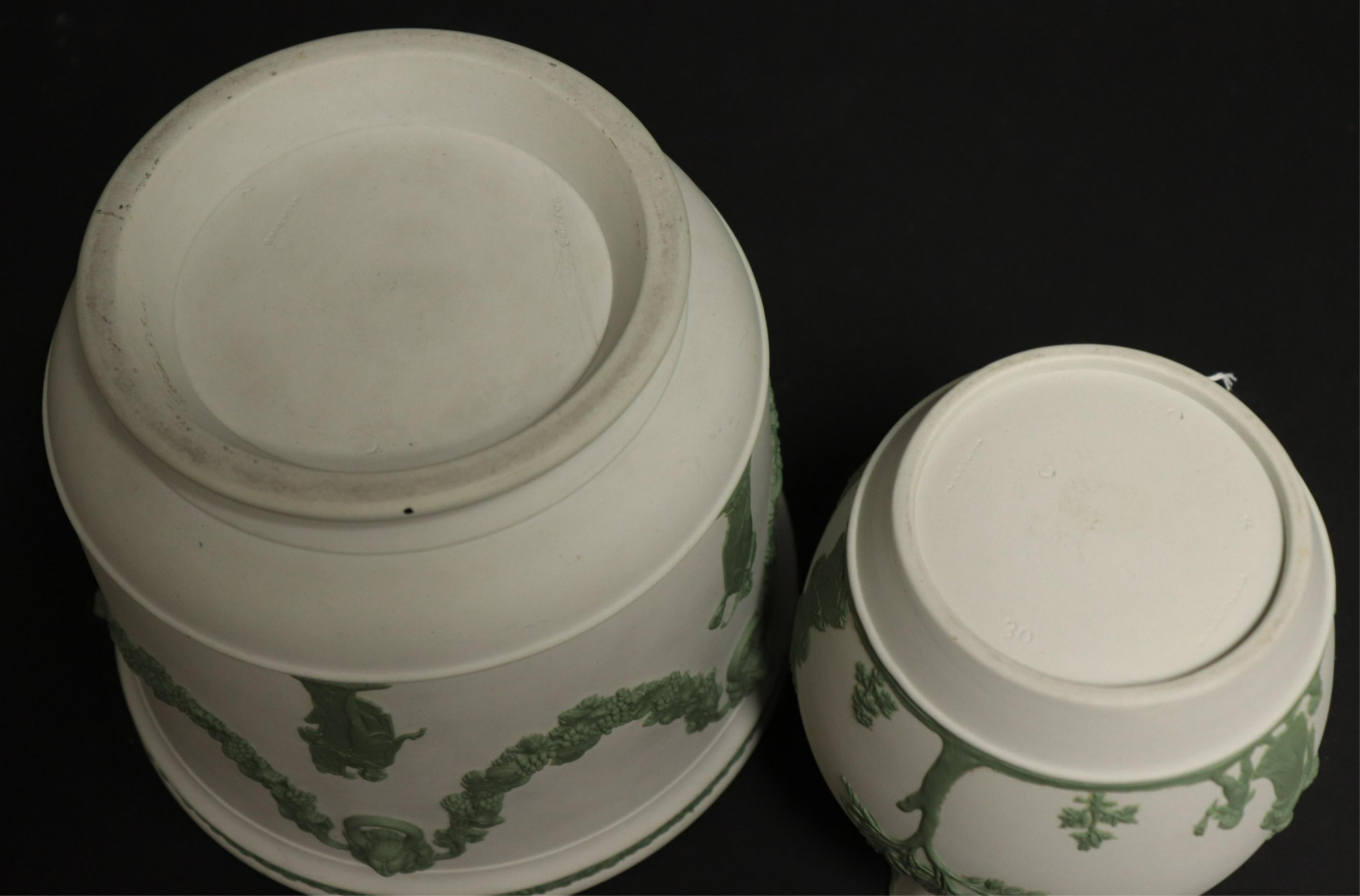 Wedgwood Jasper Dip Cache Pot & Pitcher, grey/white body with applied green figural and swag decoration, impressed mark & England (2 pc.) (ZWED4518/2)(WT)