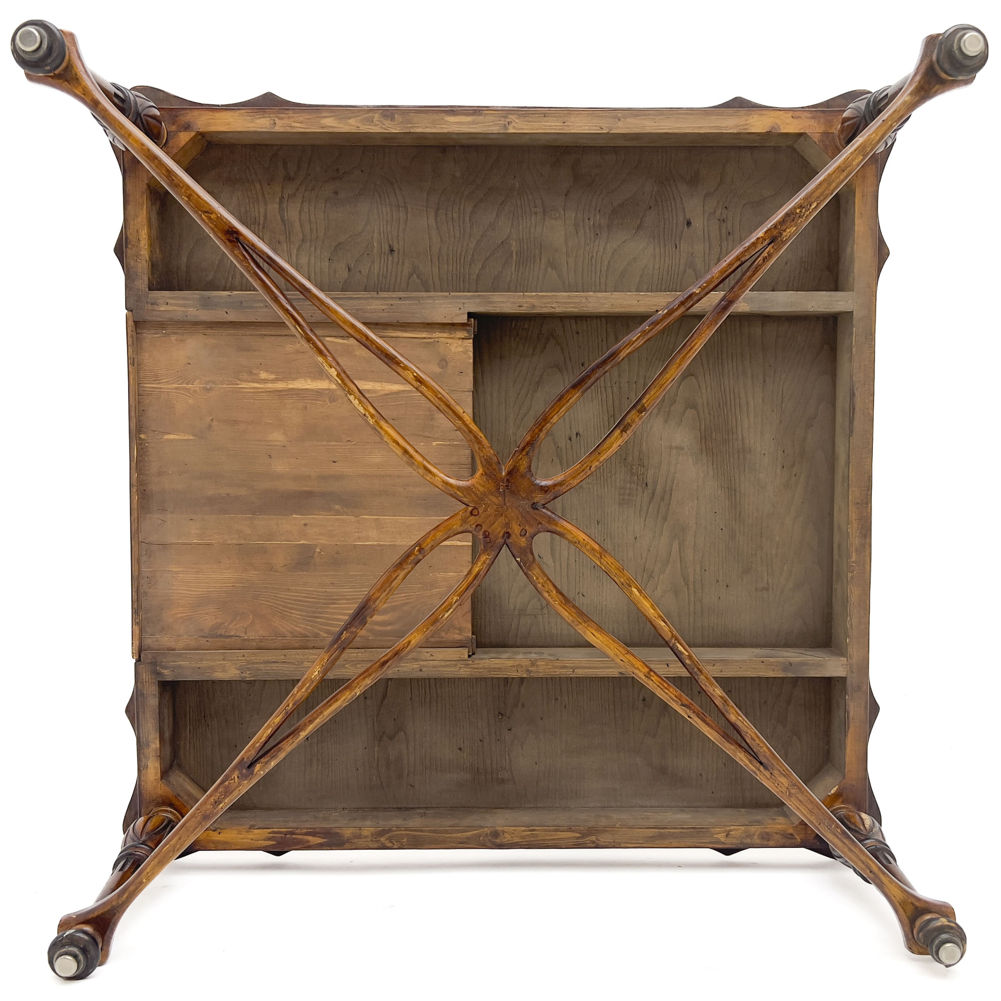 An early 20th Century cocktail table, with a parquetry veneered top and scalloped edge, with one drawer, and bell-turned legs joined by a reticulated X-stretcher base